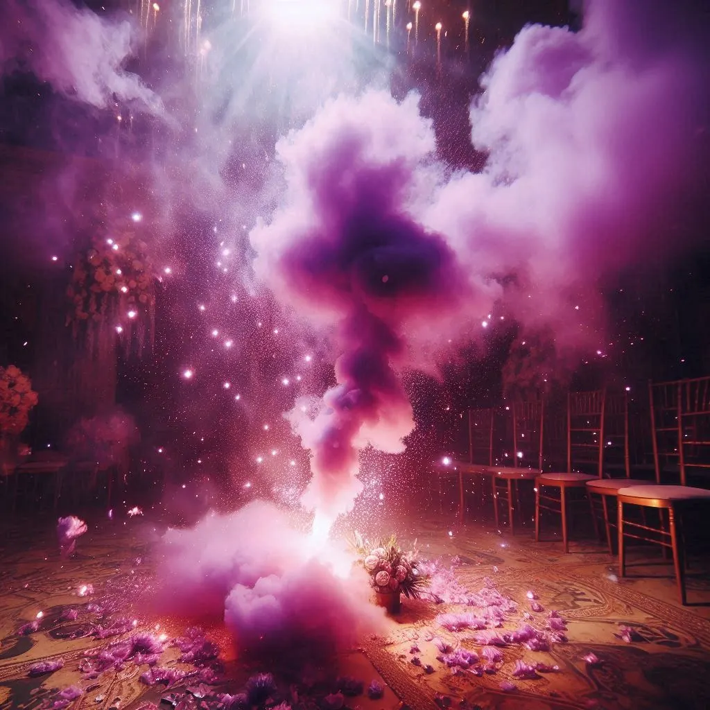 Эффектный спецэффект с плотным фиолетовым дымом и яркой стартовой вспышкой. Используется для подчёркивания кульминаций мероприятия: выходов артистов, гендерных вечеринок, арт-съёмок, шоу-программ и постановок.